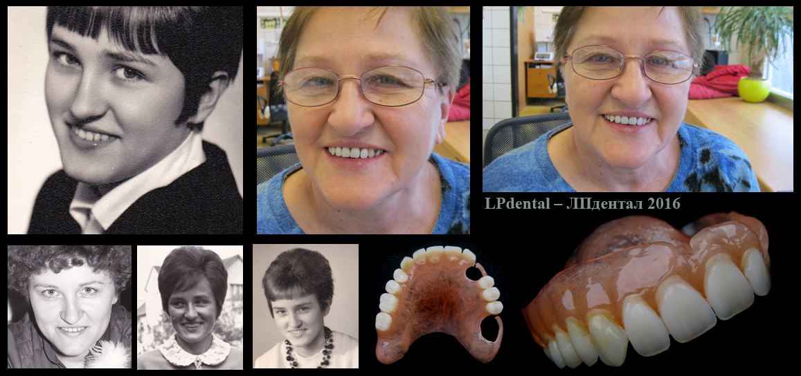 Nahrazení staré náhrady novou zhotovenou podle fotografií s původním postavením a tvarem zubů. Žena věk 67 let.